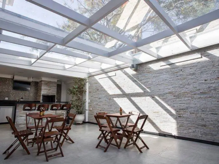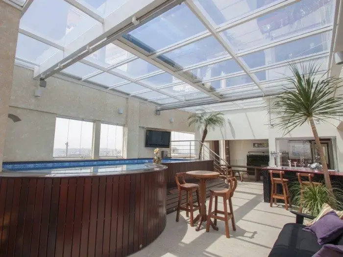 Além disso, os toldos e coberturas de vidro também são uma escolha favorável para projetos comerciais, instalados em shoppings, hotéis, clubes, escolas, restaurantes, entre outros locais que precisem de cobertura fixa ou retrátil com boa luminosidade e um teto transparente que possibilita uma boa vista nesses ambientes.